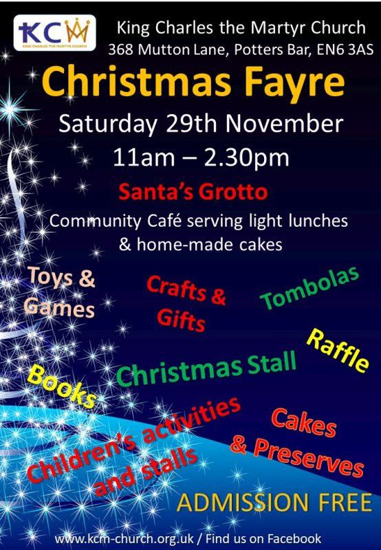 11.00-14.30: KCM Christmas Fayre. Do join us for this brilliant community event – stalls, crafts and gifts, Tombola, Santa’s Grotto and our Community Cafe will be serving refreshments, light lunches, home-made cakes and much more.
